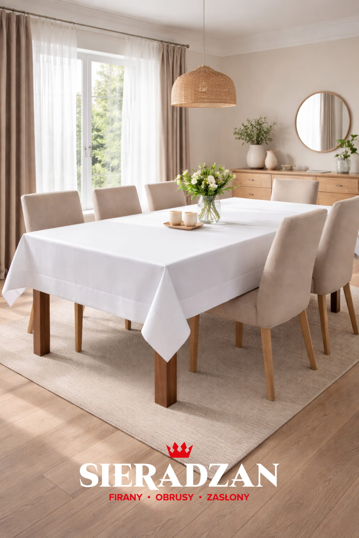 Tkanina, z której został uszyty jest w 100% polskiej produkcji, charakteryzuje się matowym, gładkim wykończeniem, wyjątkową "mięsistością" oraz idealnym śnieżnobiałym kolorem. Obrus w całości został wykonany w Polsce!
